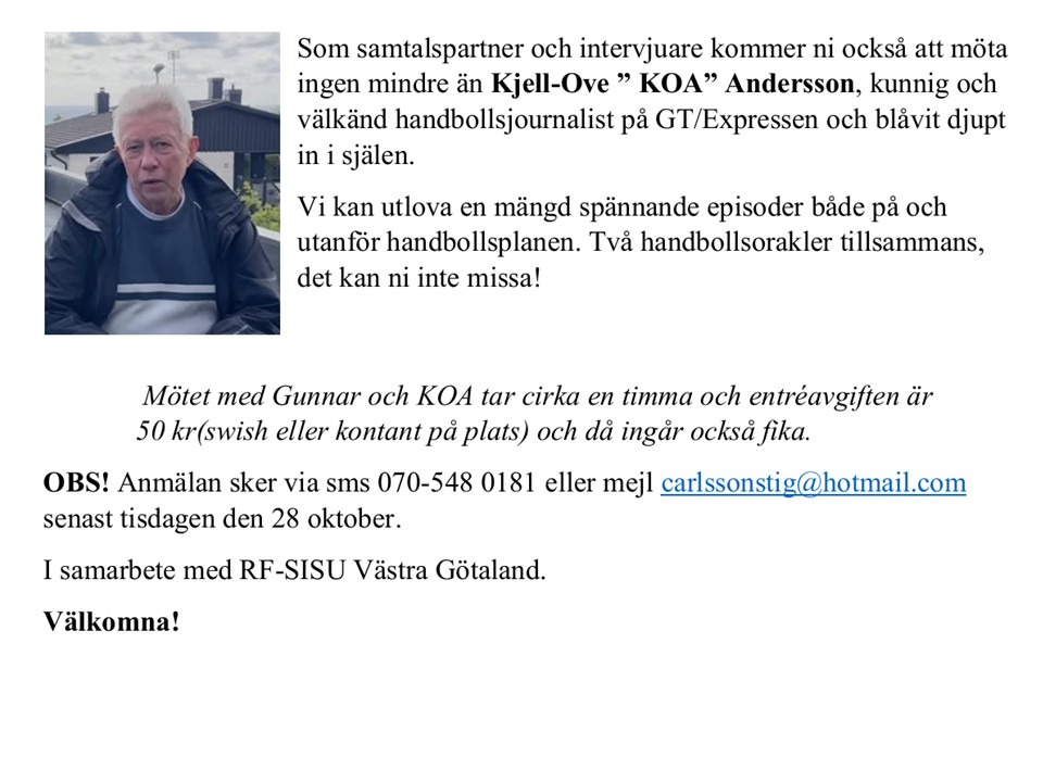 Idrottscafé med Gunnar Blombäck oktober 4, 2025 12:10:24 Urban Brumm Hör den framgångsrika handbollstränaren berätta om sitt idrottsliv Äldre WI-tidningar Sponsorer Klicka på loggan och se hemsidan Hotellbokningar Erbjudanden för idrottsföreningar