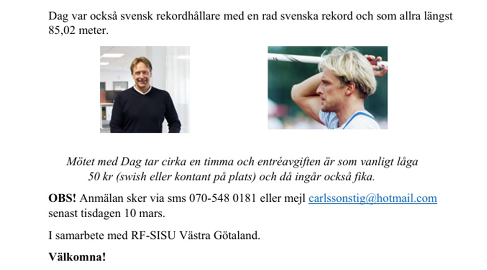 Spjutkastaren i världsklass. Se även inbjudan som pdf-fil: Annons Idrottscafé Dag Wennlund