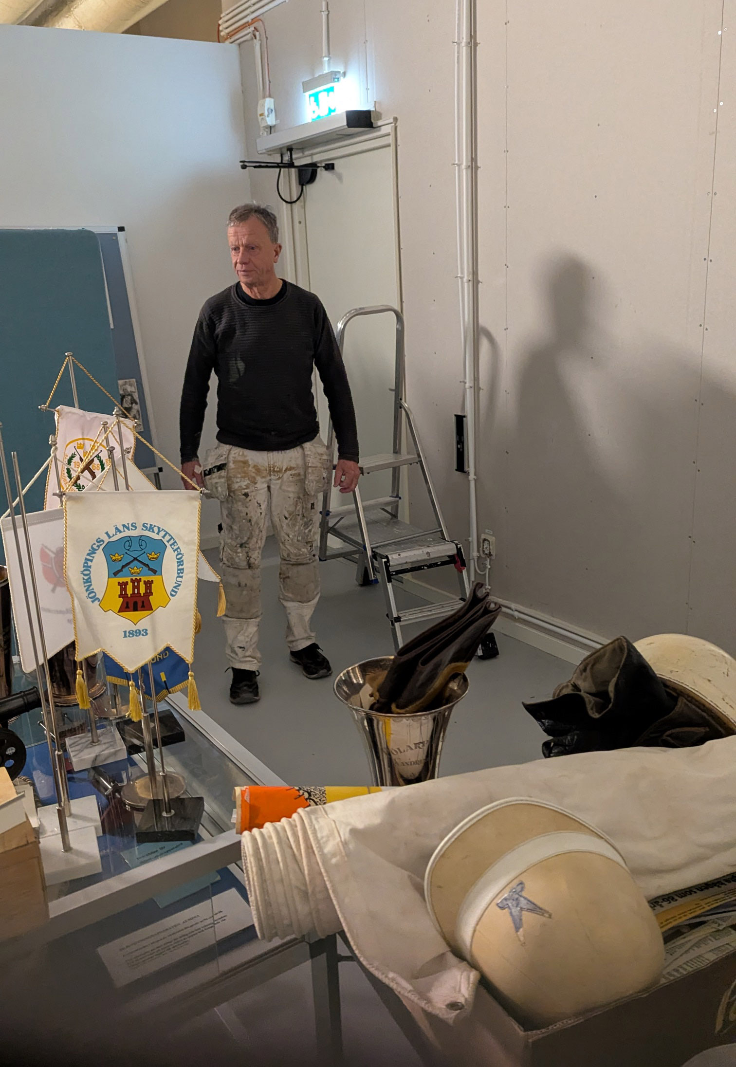 in ytterligare museiföremål in i konferensrummet, provinreda ett vitrinskåp eller två, snickra till förhöjningar av hyllor
