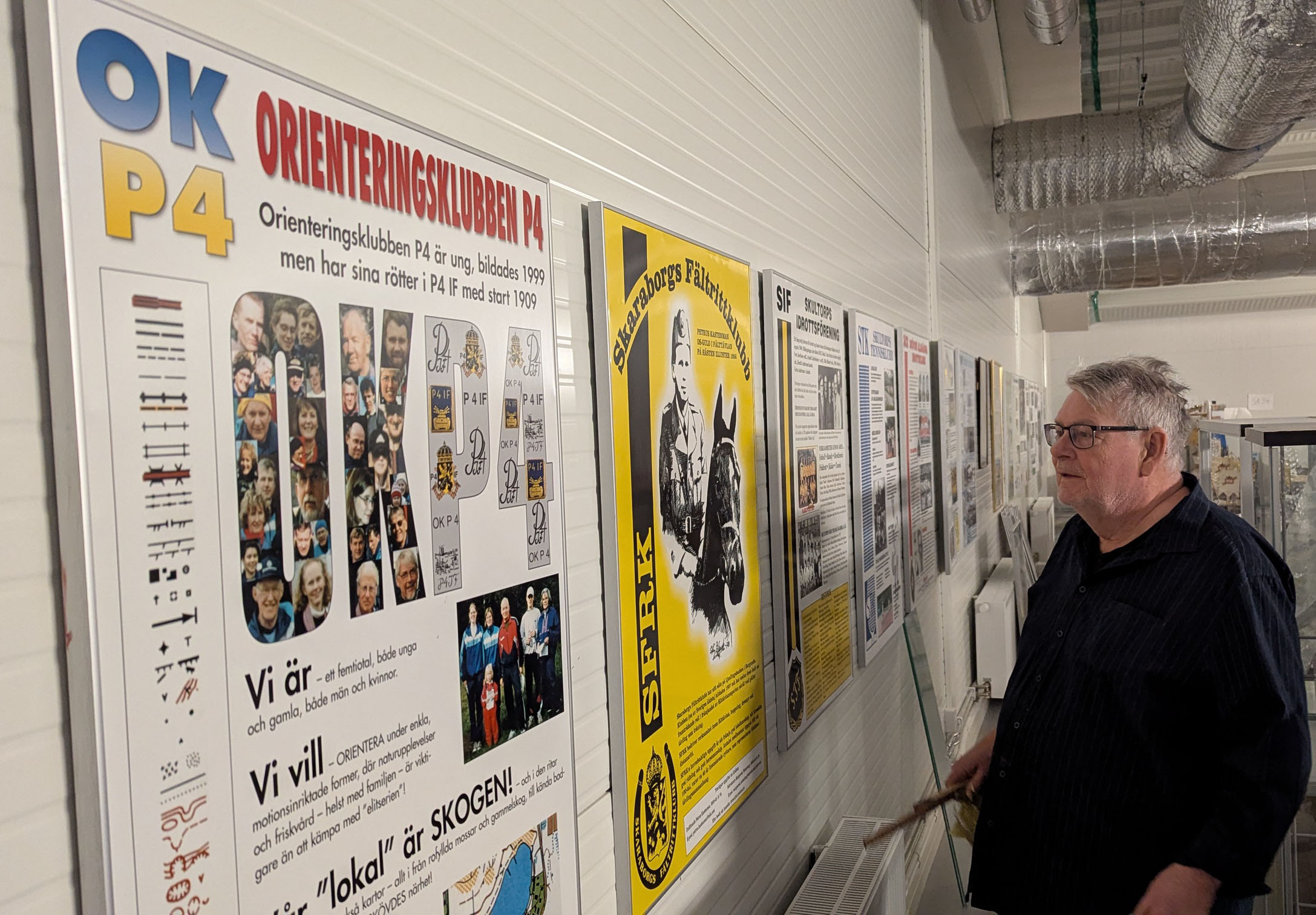 Mikael och Urban mätte och fäste krokar på väggen så att den vackra raden med föreningsaffischer skulle komma på