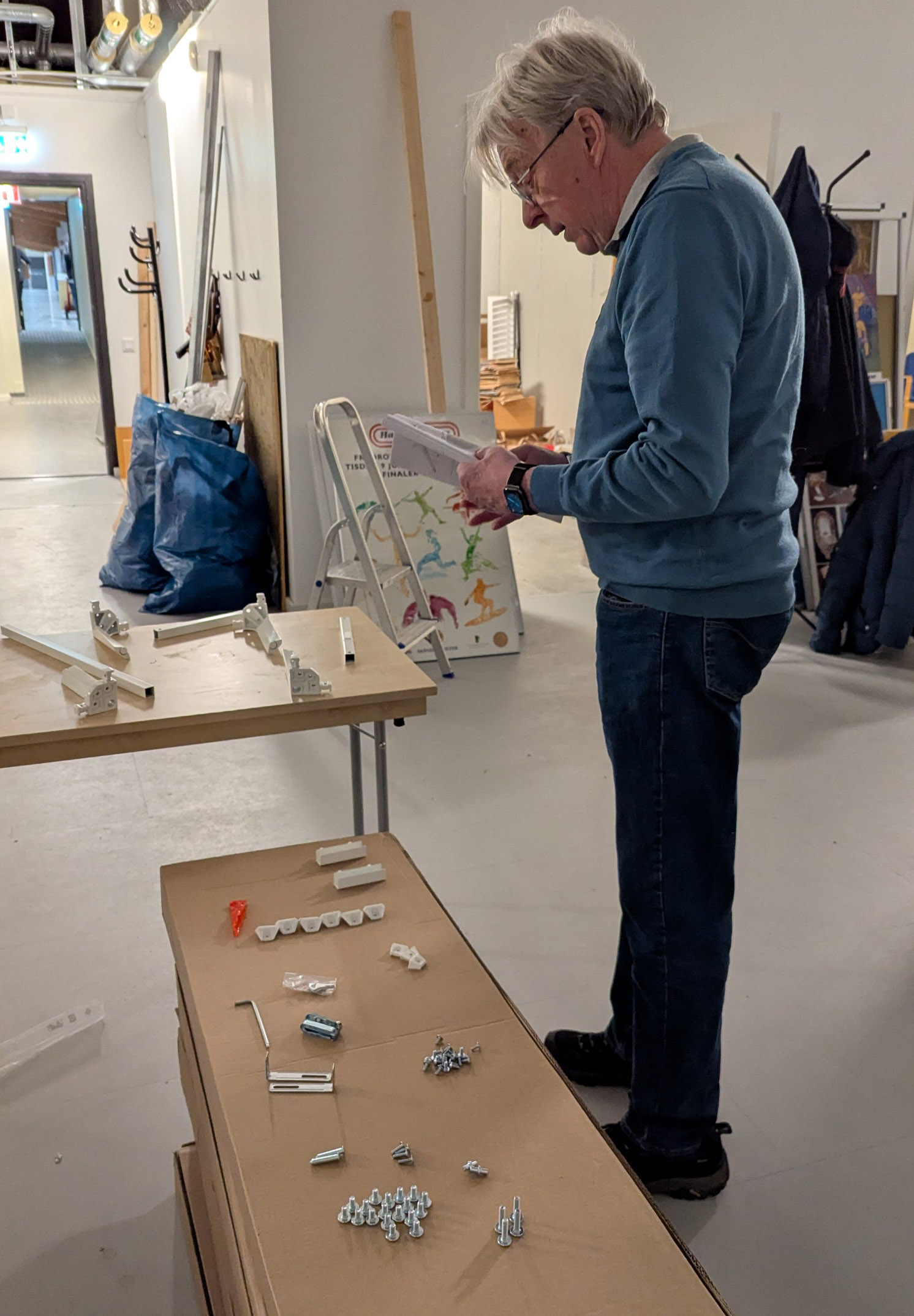 Stickan har plockat fram alla skruvar och smådetaljer och kollar att de stämmer enligt listan och Ulrika