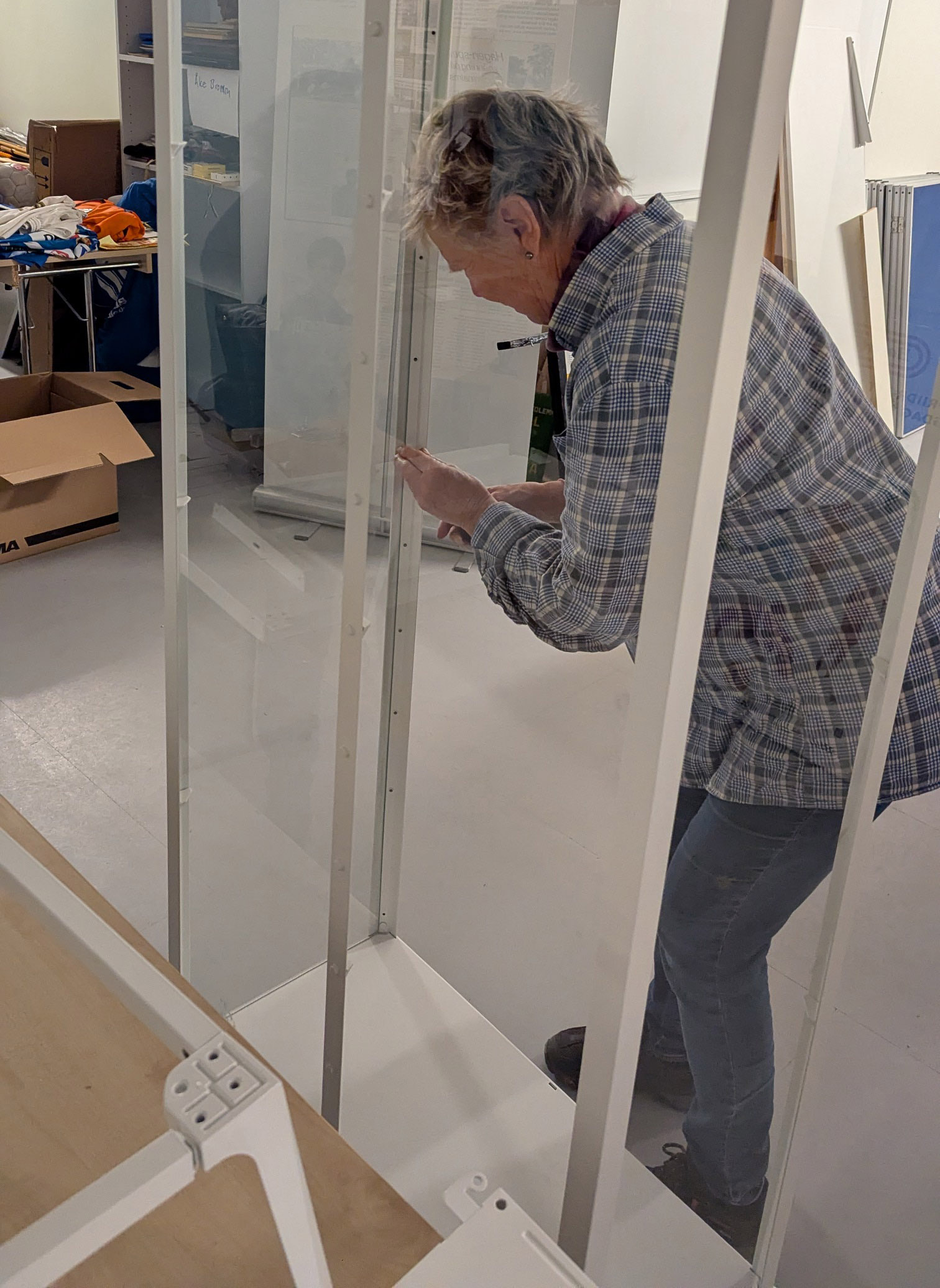 Vitrinskåpen monteras ihop enligt IKEA-metoden. Leif, Conny och Lennart hanterar delar ur det platta