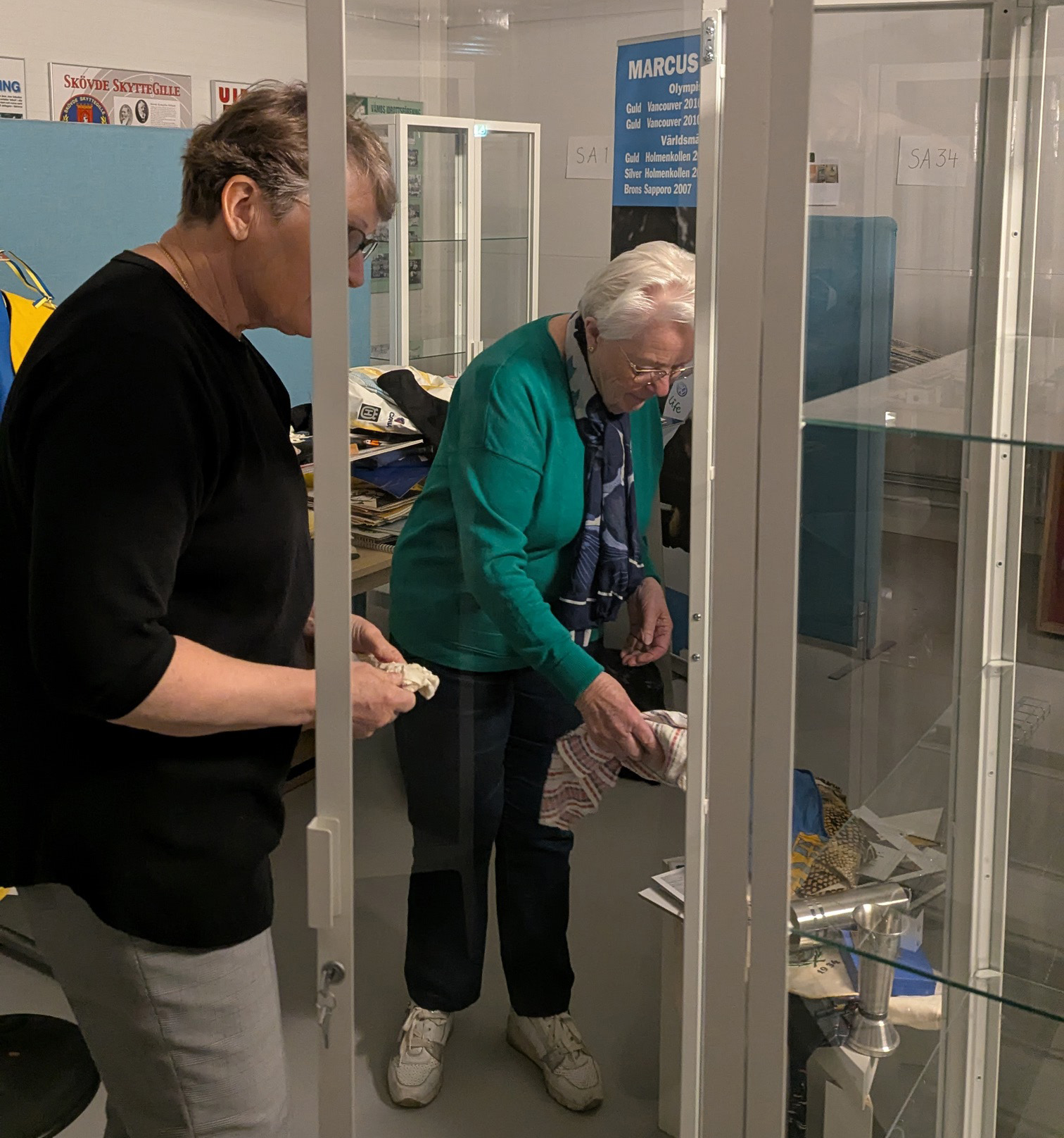 Här ses Eva-Lotte och Solveig förbereda ett vitrinskåp ämnat åt fotbollsminnen ur samlingarna. Det börjar