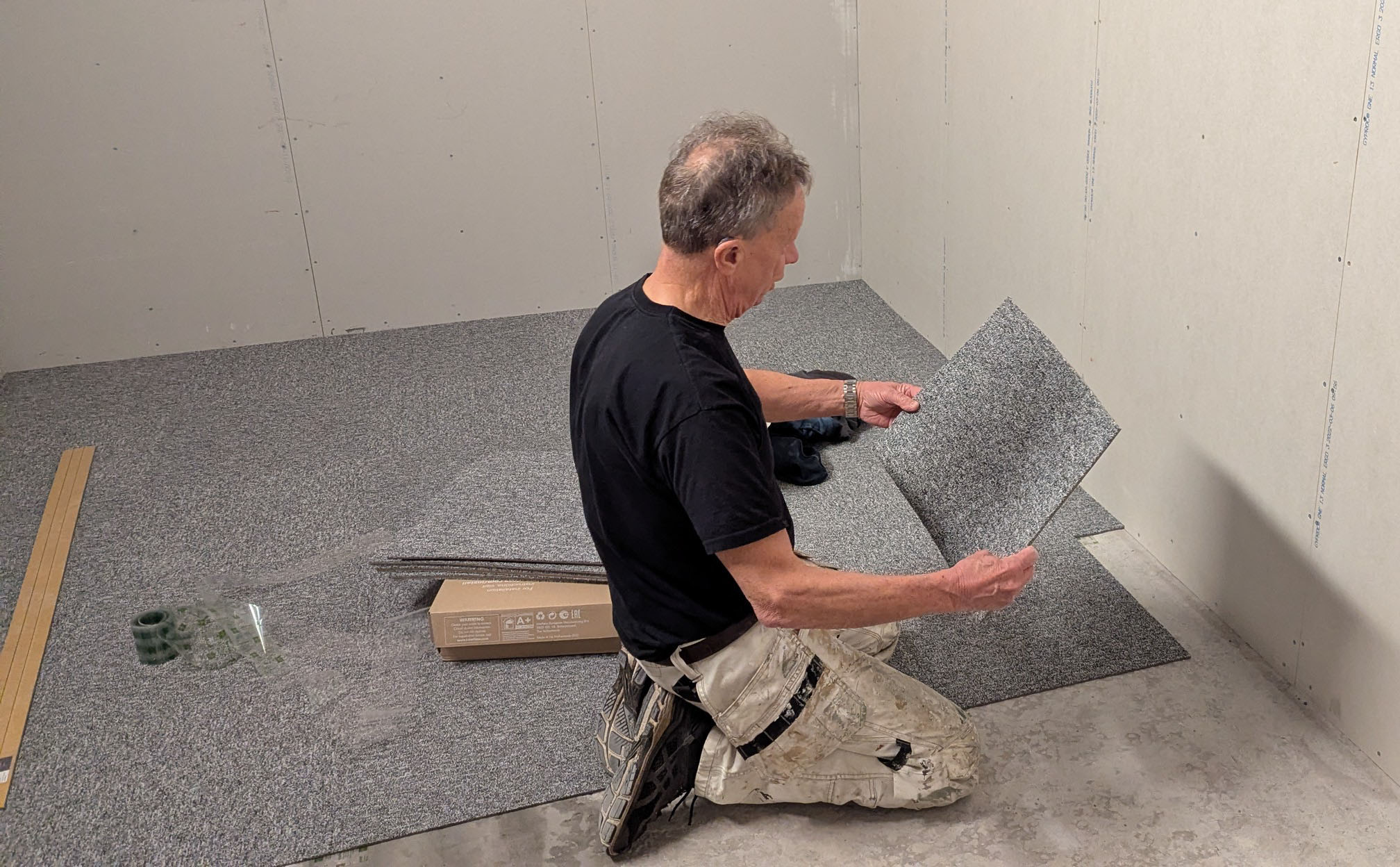 Jan-Erik fortsätter att lägga golv i biblioteksrummet med god precision.
