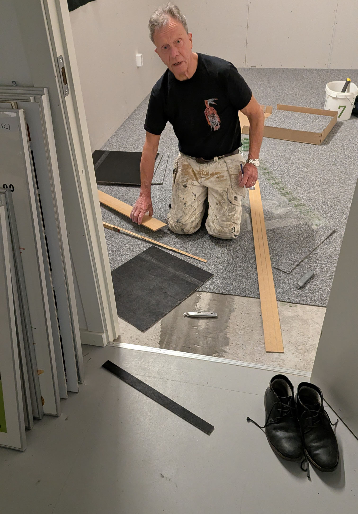 Trägen vinner! Som synes är Jan-Erik här precis i slutfasen med biblioteksgolvet. Snart kommer väggbeklädningen samt