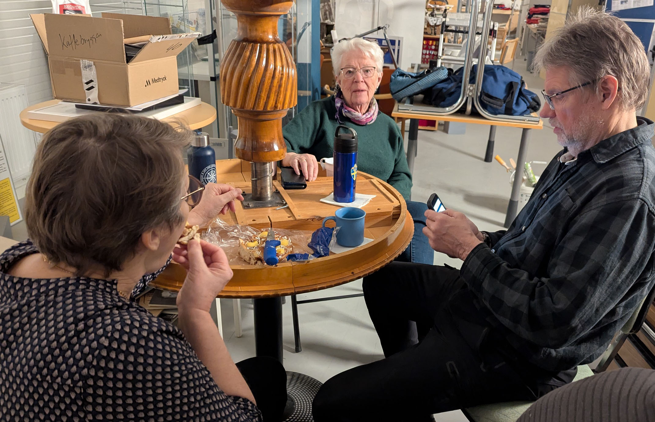 Det här är en äkta arbetsplatskaffepaus, då Ewalotte, Solveig och Bengt letat fram stolar och satt sig mitt bland