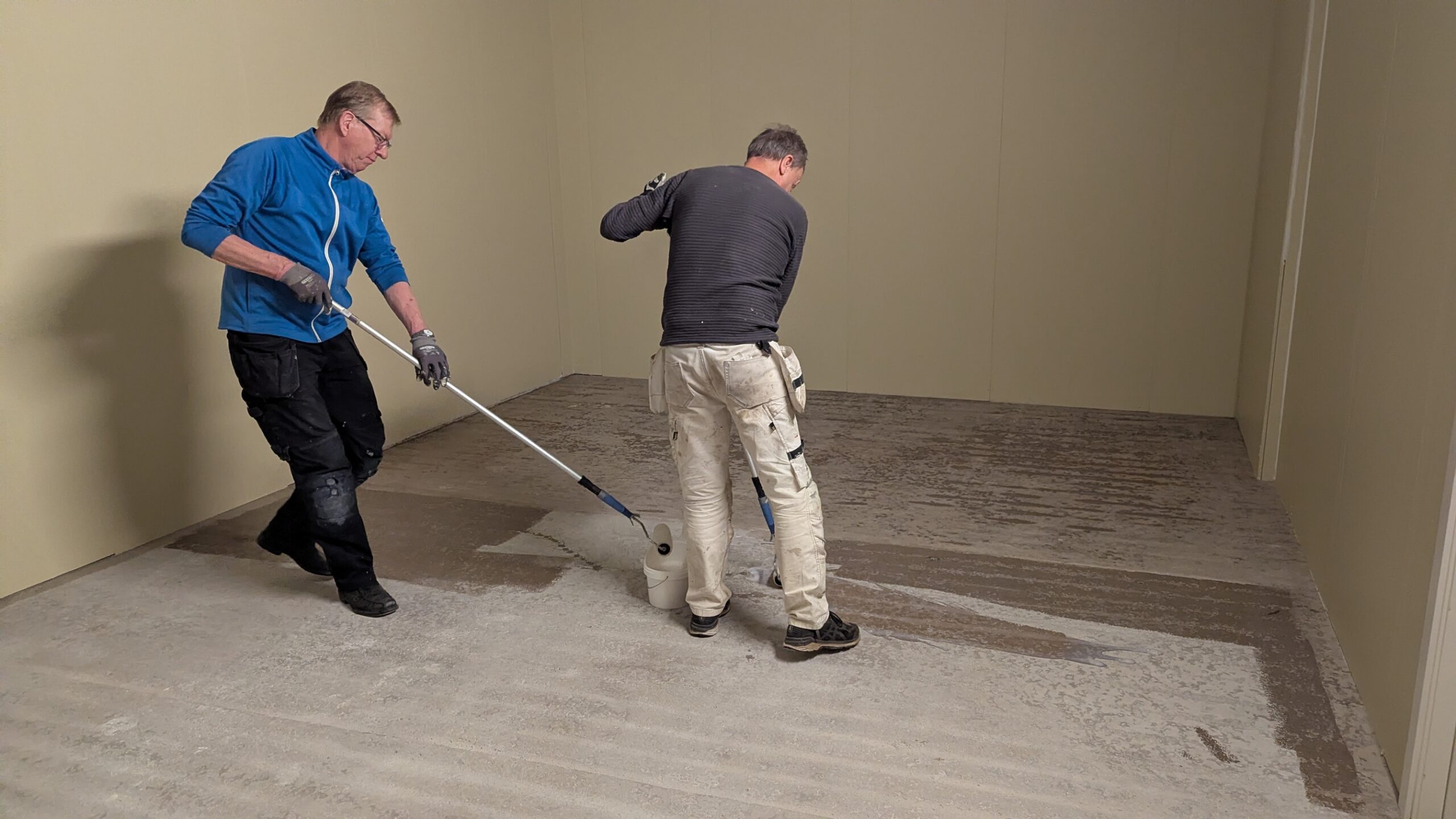 Lennart och Jan-Erik ytbehandlade golvet i konferensrummet med dammsugning och påläggande av ett damm-